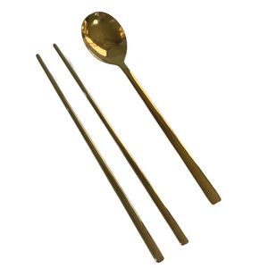 韓国式ステンレス金色スプーン箸金メッキ平箸スプーン中実長柄スプーン箸セットスプーンスプーン商用