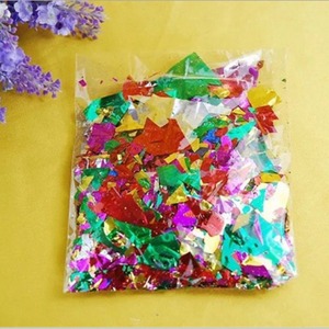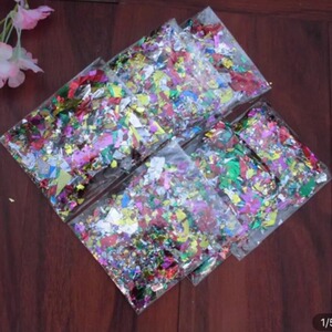 結婚結婚祝いの誕生日に手で金紙を撒いた結婚式の花を撒いた金の卵の閃光スパンコールの金紙の砕金紙