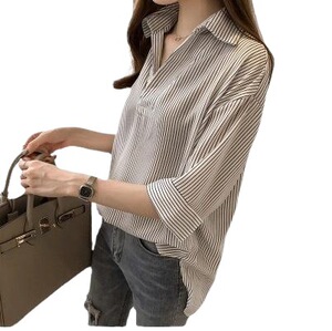 春の夏服の新型韓国版のゆったりしていて、やせているストライプのシャツの女性の7分の袖の上着のカジュアルな2024