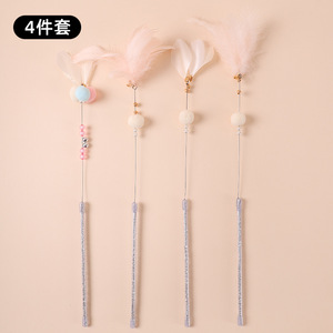大量の羽が猫をからかう棒のシャンパンの粉。