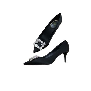 春夏の新作のサテンの角ボタンのドリルのファッション的な浅い口の雪の花のドリルのハイヒールの女性の先の細いヒールの方のボタンの靴の結婚披露宴