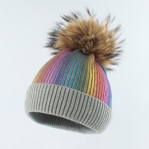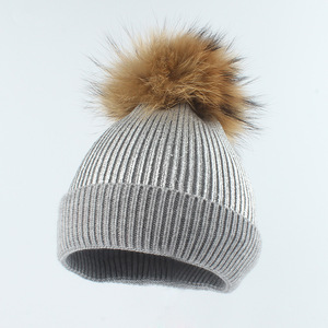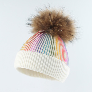 子供用アライグマ毛玉帽子、秋冬新作、金箔プリント、ニット毛糸、ストライプ、カールエッジ、保温帽子、親子帽子