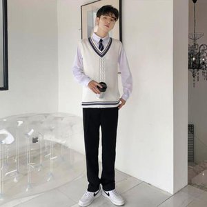 男性長袖シャツ + 黒ズボン + 一刀セーター + 一刀ネクタイ