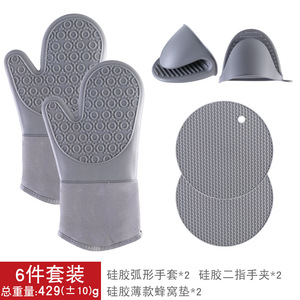 【グレー6点セット】柄布カーブ手袋*2+コットン鍋つかみ*2+32gハンドクリップ*2