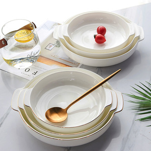 純白の骨磁器の金辺の両耳の巣の皿の陶磁器の家庭用の料理の皿のアイデアの円形の深い皿の取っ手のスープの皿は印字することができます。