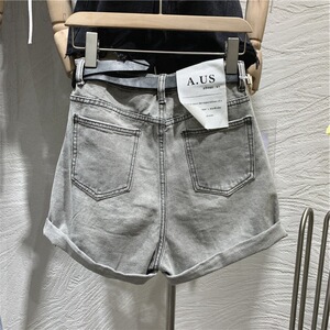 香港風bf新型白灰色高腰デニム半ズボン女性がゆったりしていて、やせています。