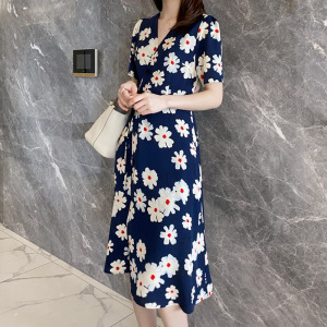 特別価格の現物のフランスのワンピースの小さい清新なプリントのボタンの結び目の帯はやせているお茶の休みのスカートの周りでスカートの女性を包みます。