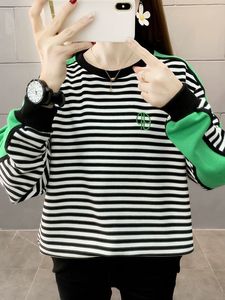欧貨2025秋新作 韓国風ゆったり着痩せ効果のある配色ストライプ丸首長袖テリーセーター 太め体型向け大きいサイズ