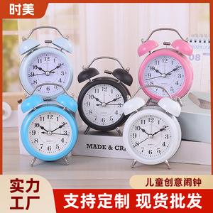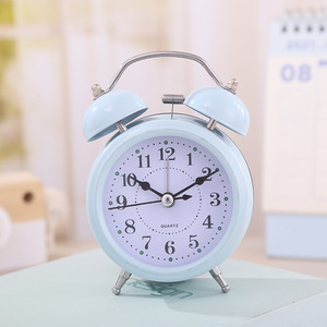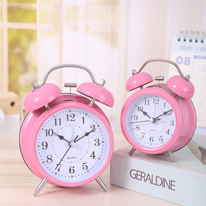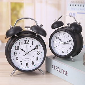 現代のシンプルな目覚まし時計は静かな金属の子供の寝室のベッドの上でベルを鳴らして夜の明かりの電池の時計の贈り物を持っています。