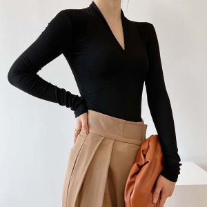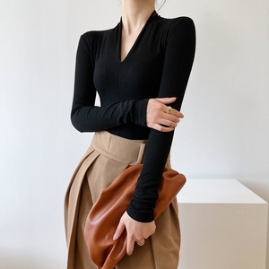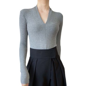 秋の女性用長袖Tシャツ、Vネック、タイトフィット無地ボトムシャツ、ネットセレブガールズイン超人気トップス、スリムフィット