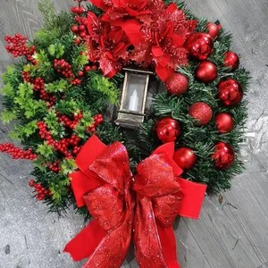 新しいクリスマスデコレーション、クリスマスオイルランプ、クリスマスレッドフラワー、クリスマスリース、ドアハンギング、クリエイティブな赤いリボン