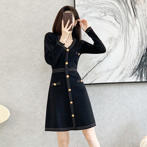 22秋冬服ファッション気質がやせて腰の小さい香風a字毛のスカートの小さい黒いスカートのニットのワンピースの女性を収めます。