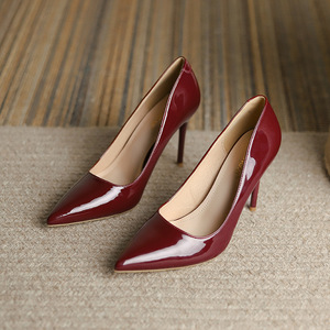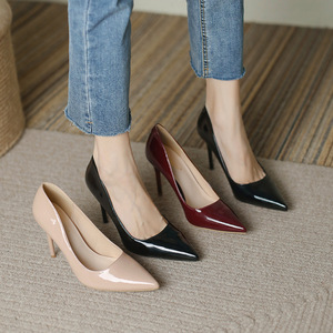9cmの尖ったつま先の漆皮ハイヒール、2025年春のヌードカラー細ヒール、妖精風レディースシューズ