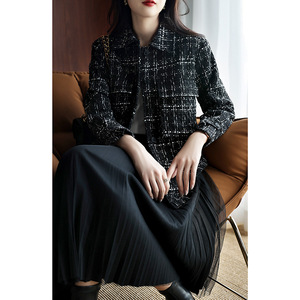 2025秋冬新作 上品通勤風 襟付き無地と黒の格子柄が組み合わせた韓国風シングルブレストレトロジャケット(レディース)