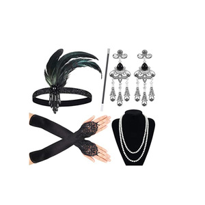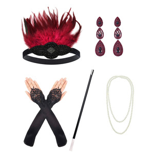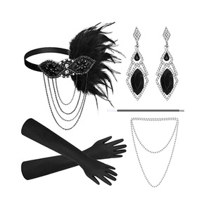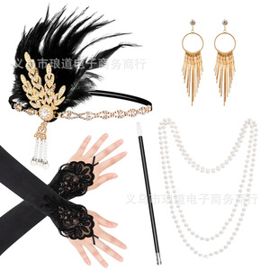 ギャツビーパーティーフェザー合金ヘッドバンド真珠ネックレスタバコロッド手袋セットレトロヘップボーンドレスアクセサリー