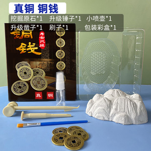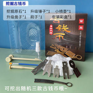 考古学の掘削のおもちゃは宝を掘って古い貨幣の刀の貨幣の銅銭のブラインドの箱の金属の材質を隠します。