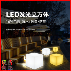 光る立方体のイルミネーションの屋外はバーの腰掛けを撒きます。