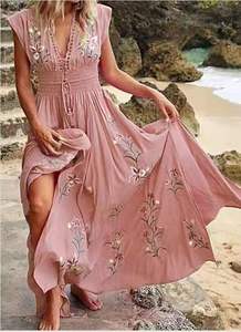 2025 ヨーロッパとアメリカの国境を越えた新しいアマゾン夏の女性の V ネック フレンチ ビーチ ボヘミアン プリント ドレス