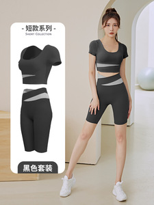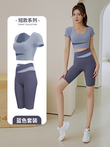 色合わせ半袖ヨガ服セット女性春夏露臍短い上着ヒップパンツランニングトレーニング服