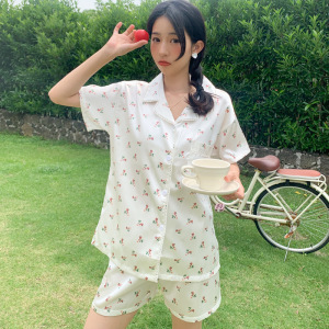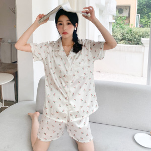 夏のパジャマの女性の半袖の半ズボンの襟のカーディガンの糸の家の服のスーツのネットの赤い金は実際にプリントの輪をいっぱいたたいて代行します。