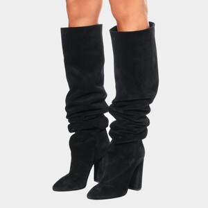 欧米風のファッションモデルのしわの長いブーツの米の白い赤いつや消しは膝の長いブーツの太さとハイヒールの女性の靴の大きいサイズを越えます。