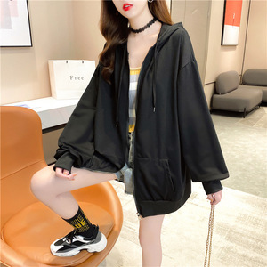 2025年春秋新作、ゆったりとした韓国風ミドル丈ジップアップスウェットシャツ、レディーストップス、カジュアルスタイル