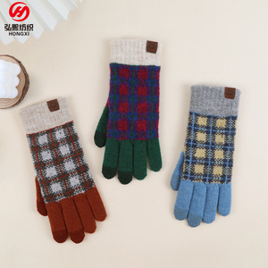 大人用ウール冬用手袋 女性用 日韓風 格子柄 アウトドア 保温 防寒 裏起毛 ニット サイクリング フルフィンガーグローブ