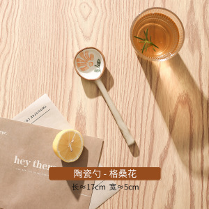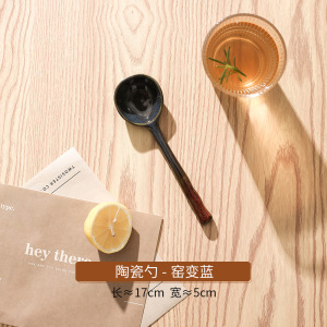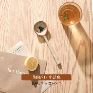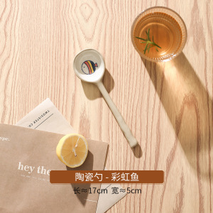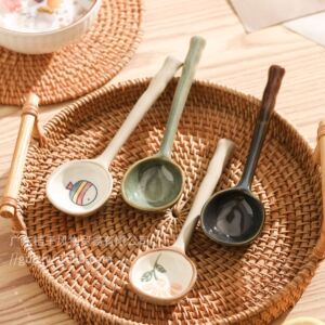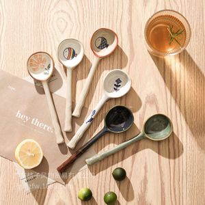 中国の粗い陶器手描きスプーンロングハンドルスプーン磁器ライススプーン漫画小魚釉下色セラミックスプーン窯回し