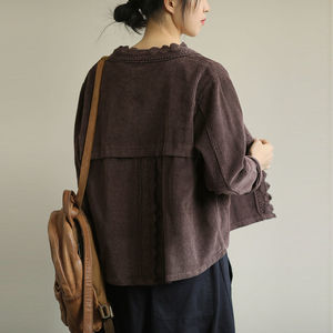 大きいサイズのゆったりした文芸の長袖の丸首のコートの秋の服の新型の純色のコーデュロイのレースの百合の短いコート