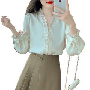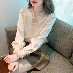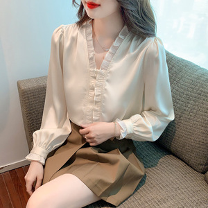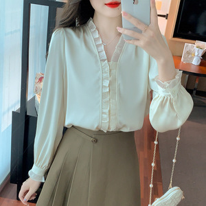 2023春の新しいフランスのレトロな気質の長袖のシャツの女性のデザイン感の小さい衆の木の耳元のvネックの上着