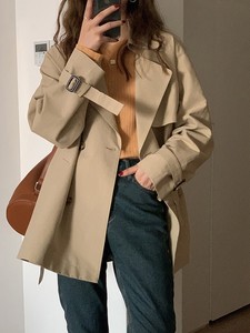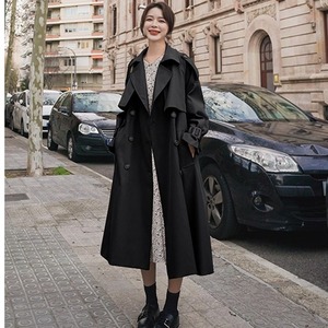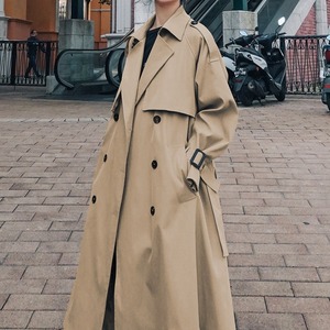 2025秋冬流行レディーストレンチコート、ミドル丈カーキ色韓国風ゆったり膝丈ブリティッシュスタイルジャケット