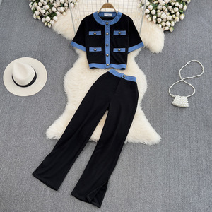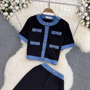 ファッションスーツの女性韓国版の気質の丸首の単列はデニムを掛けて色のポリエステルの短い上着にぶつかります。