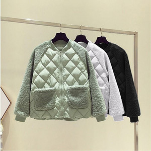 薄手の綿服の女性の新型の大きいサイズの短いタイプの冬のジャケットの綿服のネットの赤い色はウールの子羊をまねて小さい綿入れの上着をつなぎ合わせます。