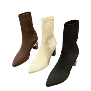 ローブーツ レディース 2025年新作 韓国風 秋冬 太ヒール フライニットソックスブーツ ポインテッドトゥ ストレッチブーツ おしゃれ 細見えブーツ