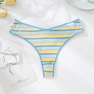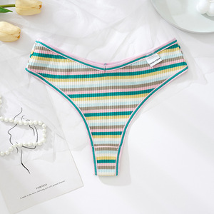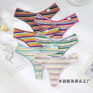 ホットな女性向け、コントラストカラーのレインボーストライプ柄、既製の純綿ショーツ、ローウエストTバック下着、通気性のある純綿