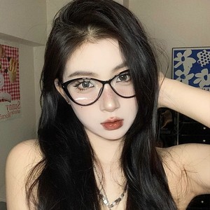 レトロ猫の目の黒い枠のメガネのすっぴんの神器の大きい枠の太い枠の大きい顔の丸い顔の鏡の枠の平面の鏡の女性の上品な敗類