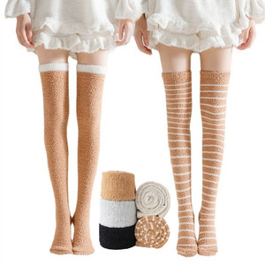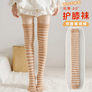 毛を落とさない膝を越えたサンゴのベルベット靴下女性秋冬日保温睡眠靴下にベルベットの厚い縞模様のかわいいストッキング