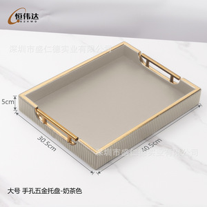大型金具金縁トレイ-ミルクティー色縦ストライプ-40.5*30.5*5cm