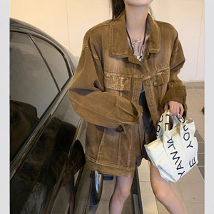 2025年アメリカンレトロ風ダメージ加工ミドル丈ジャケット カップルデニムジャケット 初秋ポロ襟長袖トップス レディースファッション