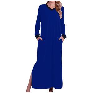 2023アマゾンの女性vネックの長いワンピースは色のポケットの頭の長袖の純色の長いスカートのパジャマの家にぶつかります。