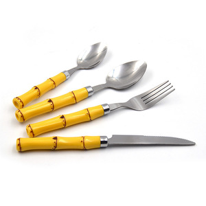 新しいステンレスの西洋の食器の刀のフォークのスプーンの家庭用ホテルのレストランの竹の節のプラスチックの取っ手の食器のセットは卸売りします。