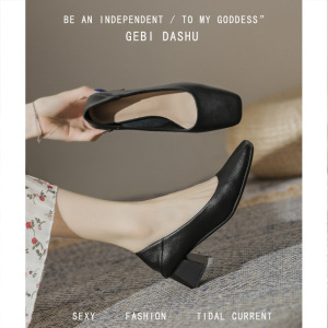 2025 新しい夏中厚ヒール多用途靴女性のレトロスクエアトゥ浅い口ソフトレザーおばあちゃんの靴黒の作業靴