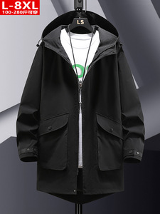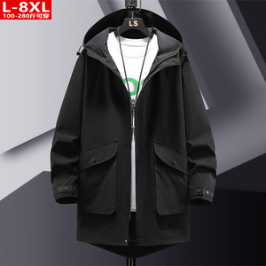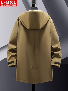 春秋のトレンドメンズハンサムワークウェア風パッチポケット付きフード付きトレンチコート、大きいサイズ、ゆったりとしたミドル丈のカジュアルジャケット