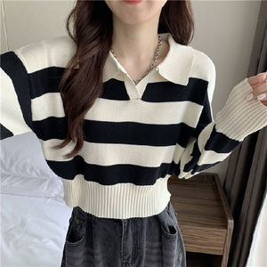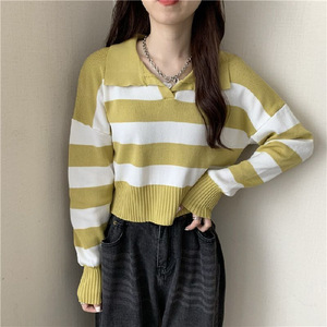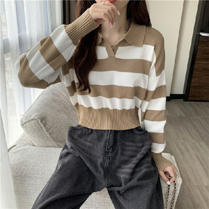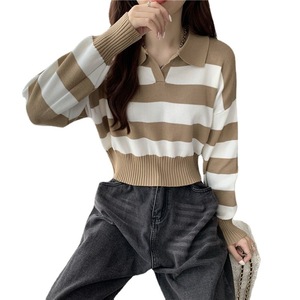 外国貿易polo襟のストライプのセーターの女性の小さい秋の新型のゆったりしている外は長袖のニットの工場を着て直接販売します。