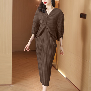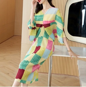 2025 夏のファッション三宅プリーツバットスリーブ大きいサイズヨーロッパとアメリカンスタイル V ネック無地ルーズスタイルドレス