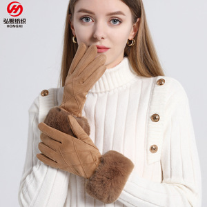 欧米のファッションの方眼の紋様のタッチパネルの成人の手袋の女性の屋外のスエードの手袋は毛の口の保温の手袋をプラスします。