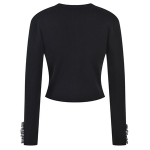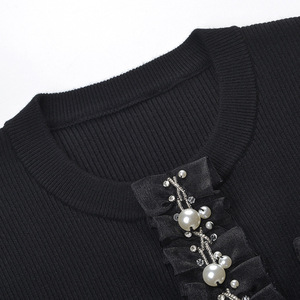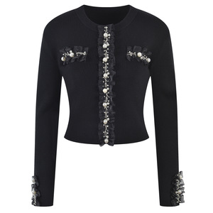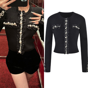 2022秋冬新作小香ニット真珠釘ドリルチェーン修身丸襟長袖黒ショートコート