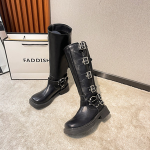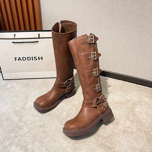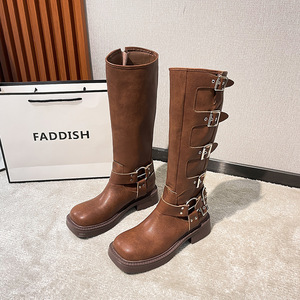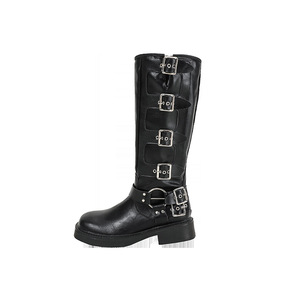 同じ本革の太さとマーティンブーツの女性西部のカウボーイブーツの復古的な美ラードの高い筒のベルトのバックルの方頭の騎士靴