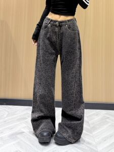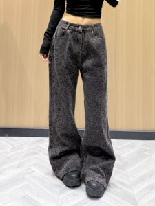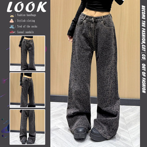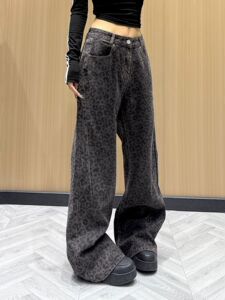 复古美式豹纹牛仔裤女2025夏季新款高腰设计感时尚宽松阔腿拖地裤
