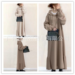 2色展開、売れ筋商品、韓国風春秋ファッション、ゆったりとしたフード付きスプライスミドル丈スウェットワンピース